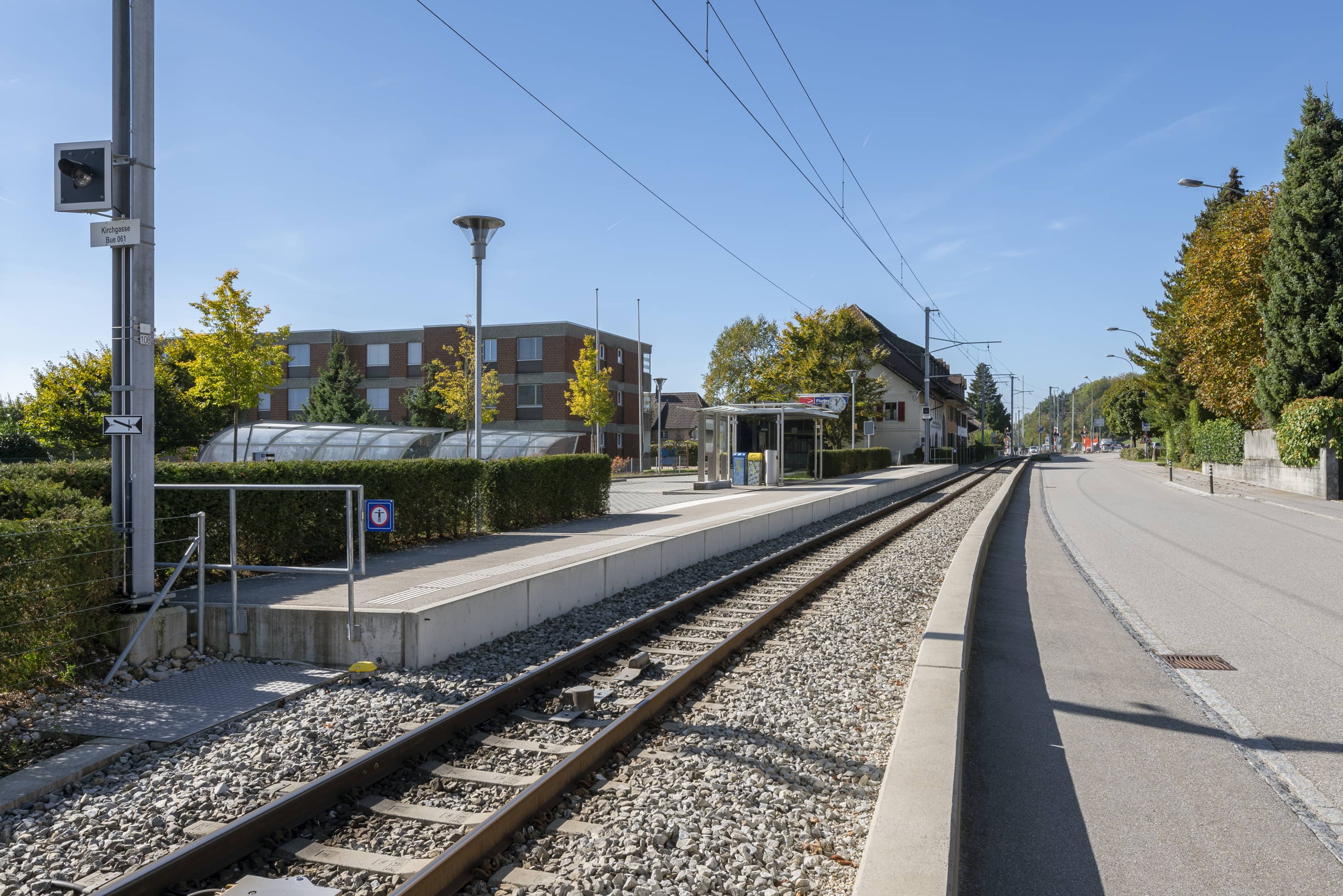 Um die Vorgaben zur Trennung zwischen Bahntrasse und der parallel dazu verlaufenden Baselstrasse einzuhalten, wurde eine ca. 350m lange und 30 cm hohe Sockelmauer erstellt.